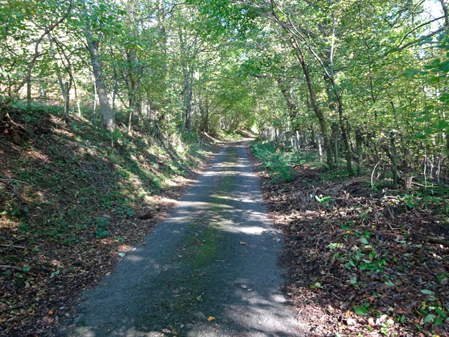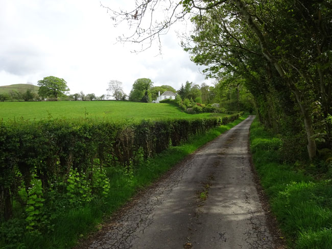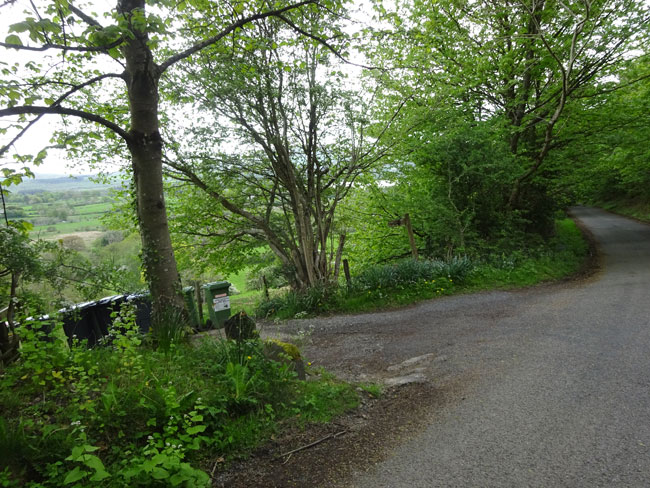 (9) Look for a small road to the left towards some properties. It is easy to miss. Walk up the road which bends to the right after the houses and then climbs gently uphill.