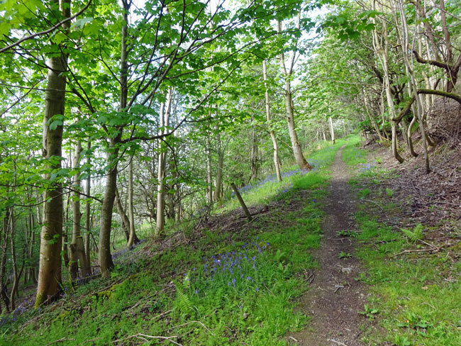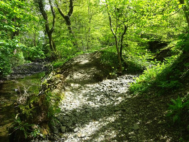 (34) You need to cross the beck at this point but there are enough stepping stones to cross without getting wet feet. Turn left on the far bank where there is a path following the beck (upstream). Further on the path then starts to head off to the right through pleasant woodland. There are a few diverging paths but keep to the obvious main path.