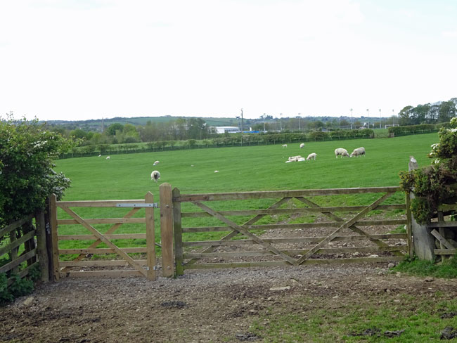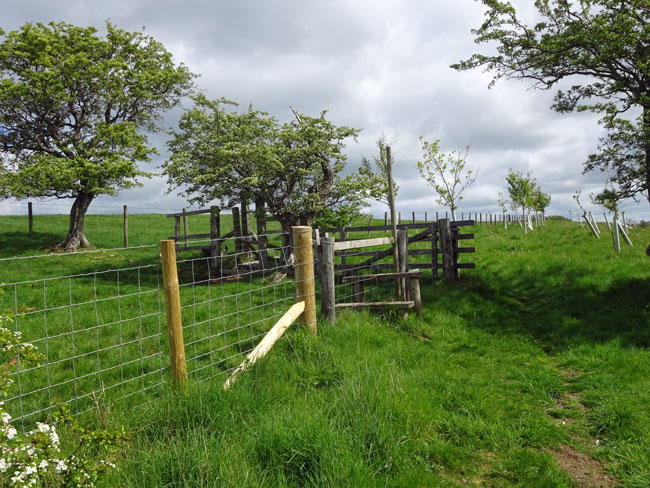 (35) After about ten minutes a gate is reached leading through into open meadow. Traverse the fields ahead keeping to the left hand boundary and passing through a number of gates. If you look up to the ridge on your left you can see your earlier path through the fields of sheep.