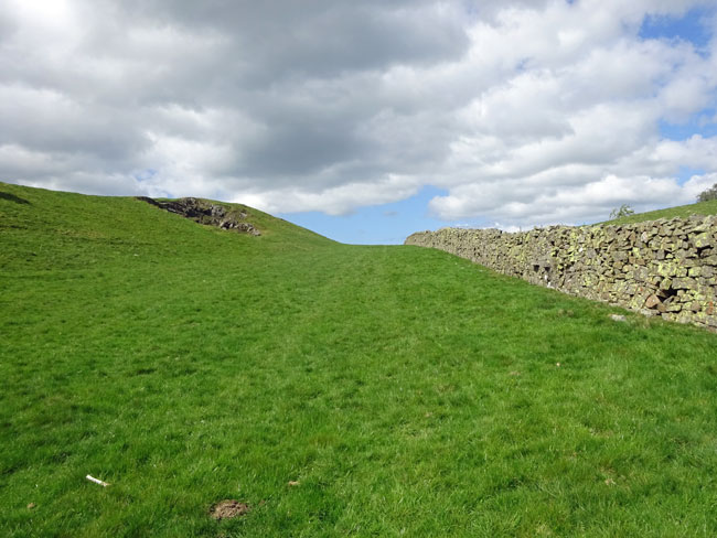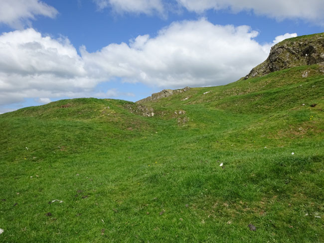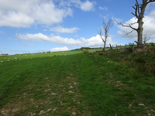 (18) You will soon come to the farm buildings with a track to the right. Ignore this and continue straight on through the gate ahead. Keeping the fence line on your right head up the, at times indistinct, path towards the rocky crag you can see at the top of the hill.