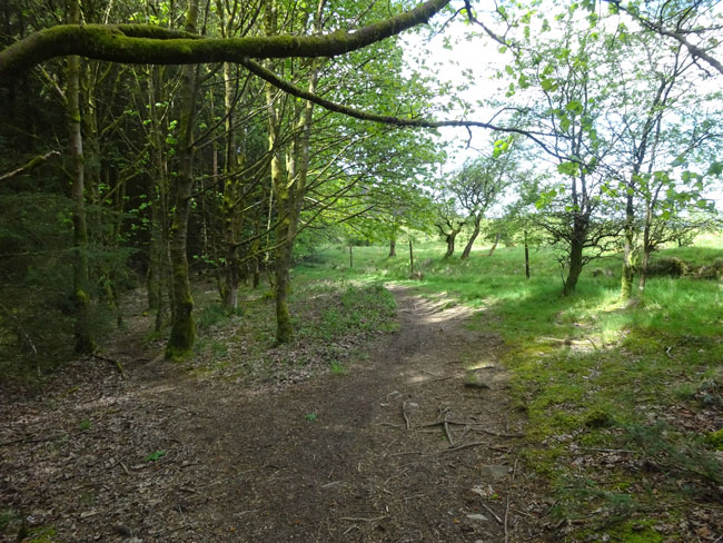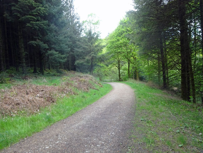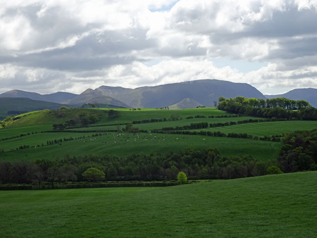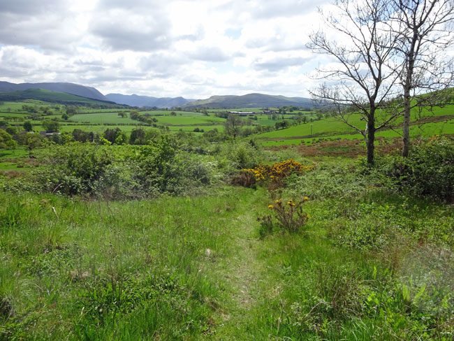 (13) The path starts climbing gently up the hillside through woodland. There are good views towards Sale Fell and Ling Fell through the trees to the left.
