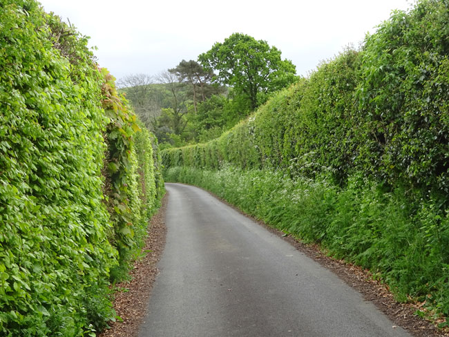 (42) The lane initially passes through very high hedges. Keep on the lane ignoring various turnings off.