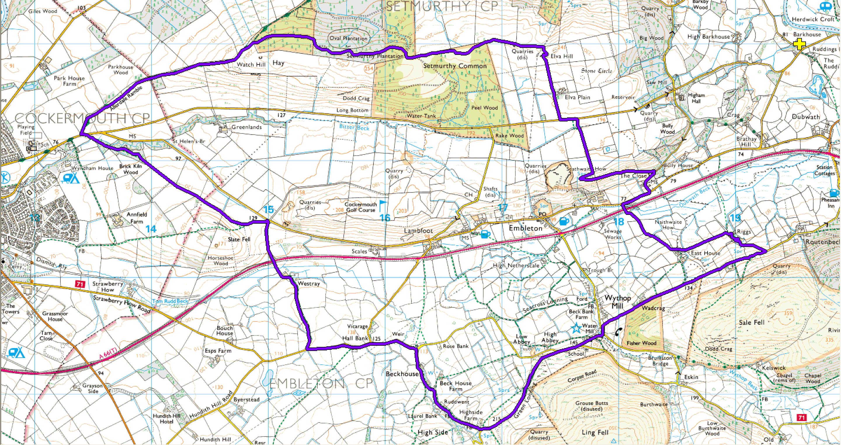 (20) There are excellent views from the top of Elva Hill both back in the direction you have come from (south) and to the north west towards Setmurthy Common with the Solway Firth and Scotland in the distance. From the top of Elva hill the route ahead can be seen following a fine stone wall heading west. Descend from Elva Hill towards the wall and a signpost next to it. If you miss the signpost don’t worry, just turn left when you reach the wall and follow it along.