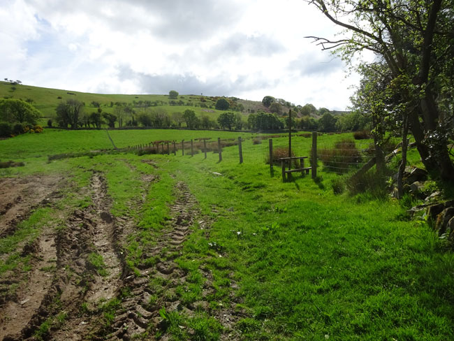 (8) Very quickly you will see a stile over the fence on your right. Cross the stile and follow the fence on your right for about 40 metres to a field boundary. Here you will see an indistinct track branching left at 45 degrees which will take you towards a gate.