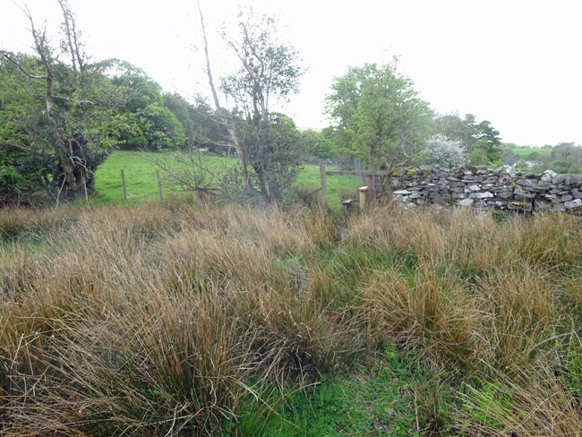 (9) Go through the gate and follow the field boundary on your right towards a marshy (reeds) area. As you approach this you will see a stile.