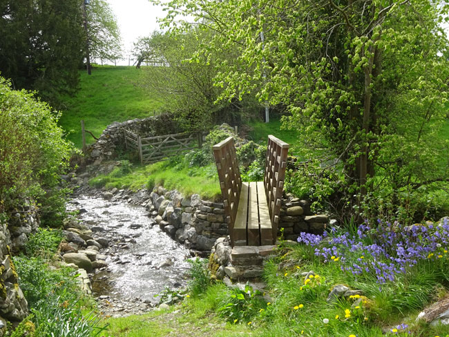 (14) The path takes you over a narrow bridge across a stream and through a gate beyond. This is the start of Seacross Lonning.