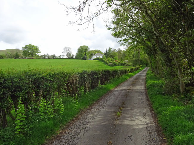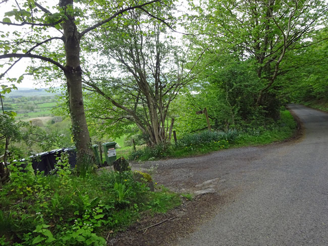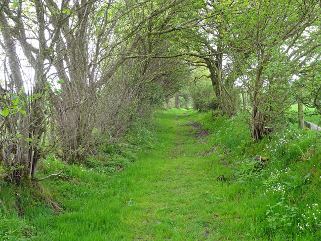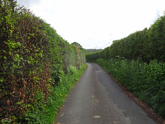 (21) The lane initially passes through very high hedges. Keep on the lane ignoring various turnings off.